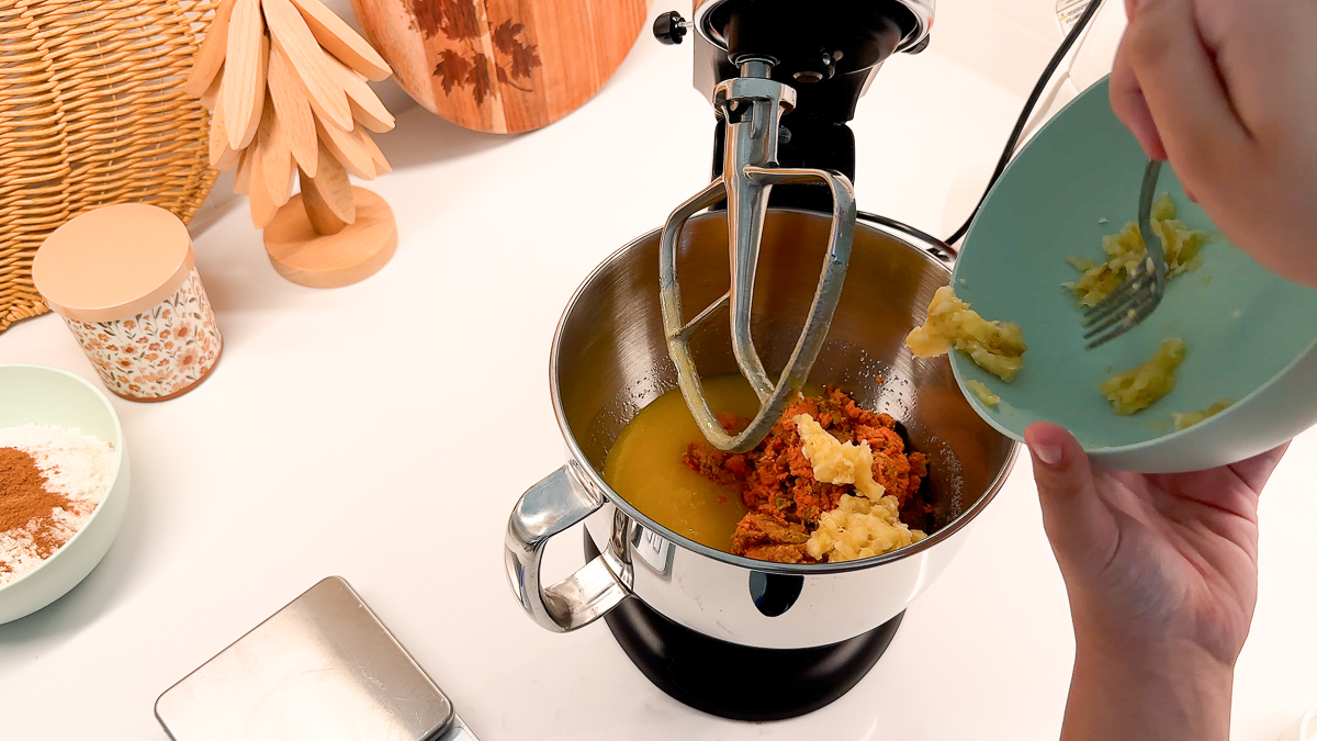 Next, fold in the mashed banana, apple pulp, and carrot pulp.